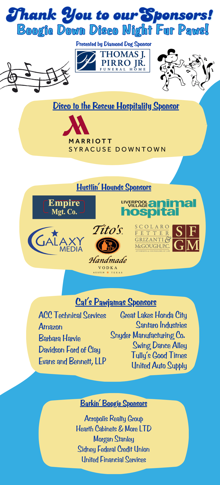 Boogie Down Disco Night Fur Paws, presented by Thomas J. Pirro Jr. Funeral Home, will take place April 24, 2026, from 7pm - 10pm in the Grand Ballroom at the Syracuse Marriott Downtown. Scroll down to purchase your tickets! The last day to purchase tickets will be April 17th so get yours today!